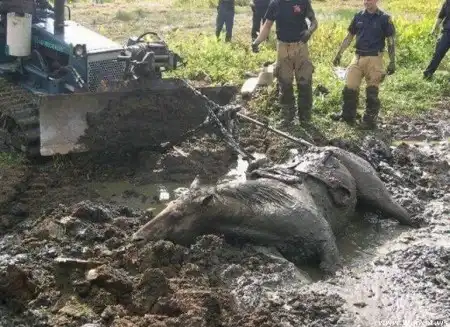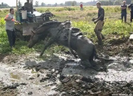 видел в реальности подобную картину еще в детстве, только главным действующим лицом была корова ))так же одно голова торчала, сначала люди своими силами пытались вытянуть, но в итоге тоже пришлось трелевочником тянуть