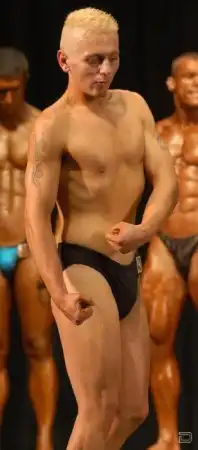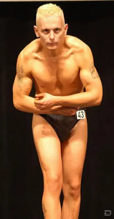 по челу видно, что он занимается в тренажерке,может начинающий....