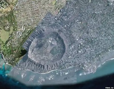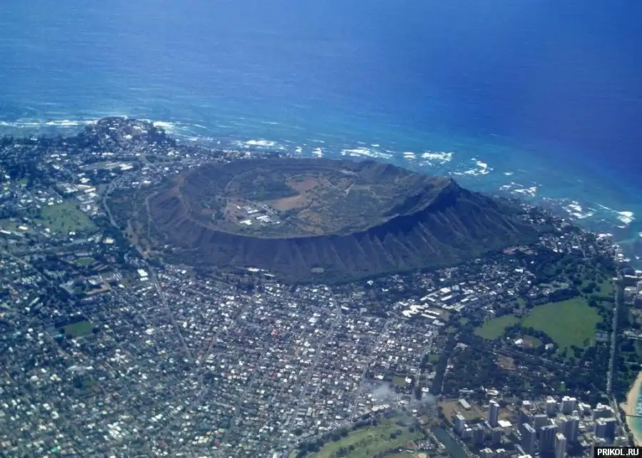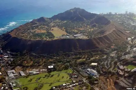 Это древнее вулканическое образование называется Diamond Head Crater, находится в Гонолулу, на Гавайском острове Оаху.---