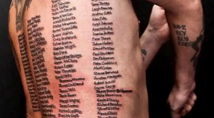 Британский военнослужащий Шон Кларк, на своей спине и груди, сделал татуировки имен 223 сослуживцев, погибших в Афганистане. Более 4-х часов потребовалось татуировщику на выполнение этой работы.---