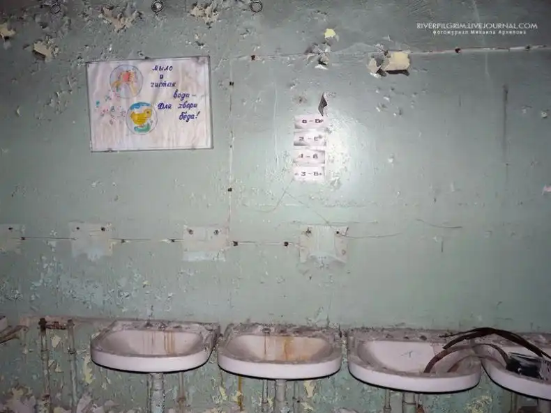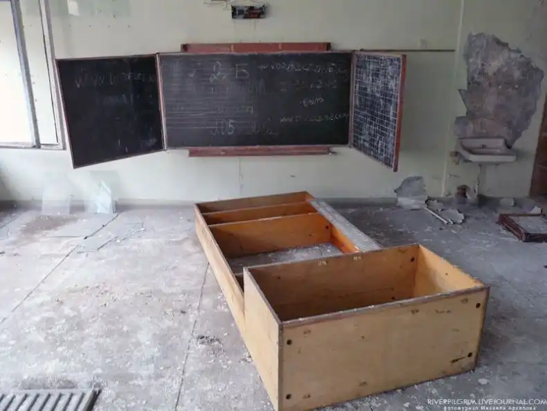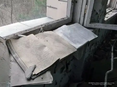 В коридоре журналы, обрывки газет, агитплакаты и прочие атрибуты времен работы школы аккуратно разложены, чтобы не копаясь в пыли и грязи их можно было заснять.