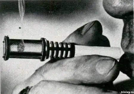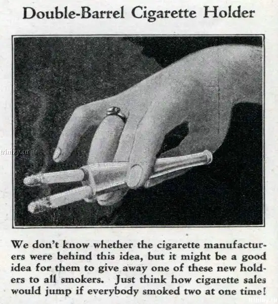 1931г. Вах, какая идея. Перевод: "Мы не знаем была ли это идея производителей сигарет, но они бы поступили правильно, раздав курильщикам такие мундштуки. Только подумайте как возрастут продажи сигарет, если все будут курить по две сигареты за раз"