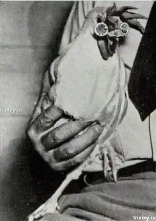Петушинная жестокость 1938 года. Чтобы избежать дальнейших смертей среди своих подопечных, фермер надел на них розовые очки.