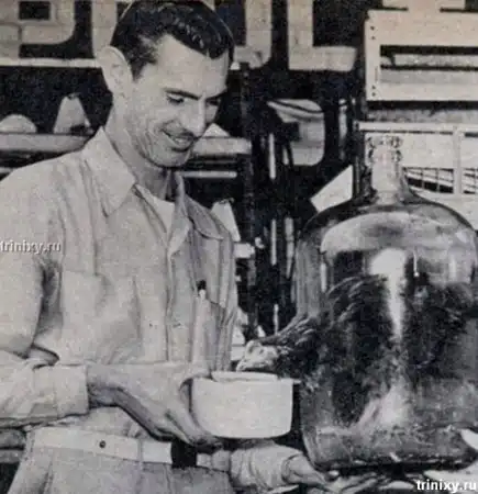 Креатив 1949го. Берем цыпленка, сажаем в бутыль, он там растет и получается банзай-курица.