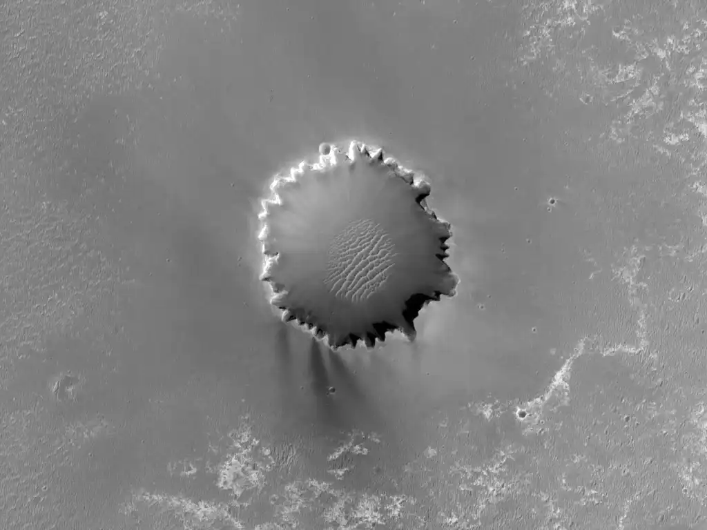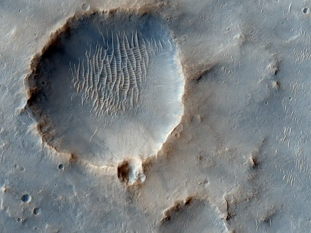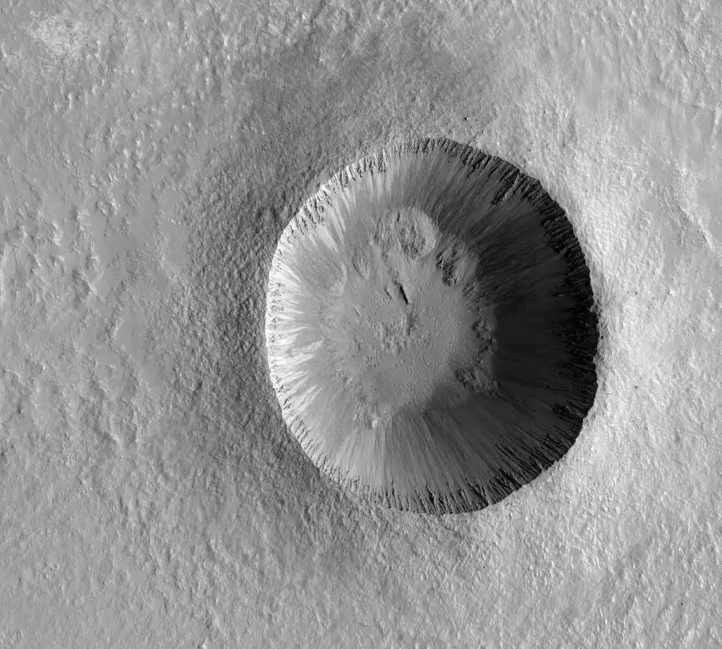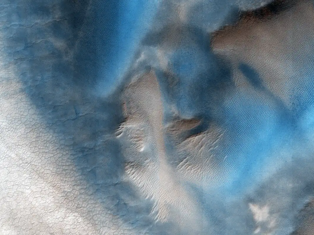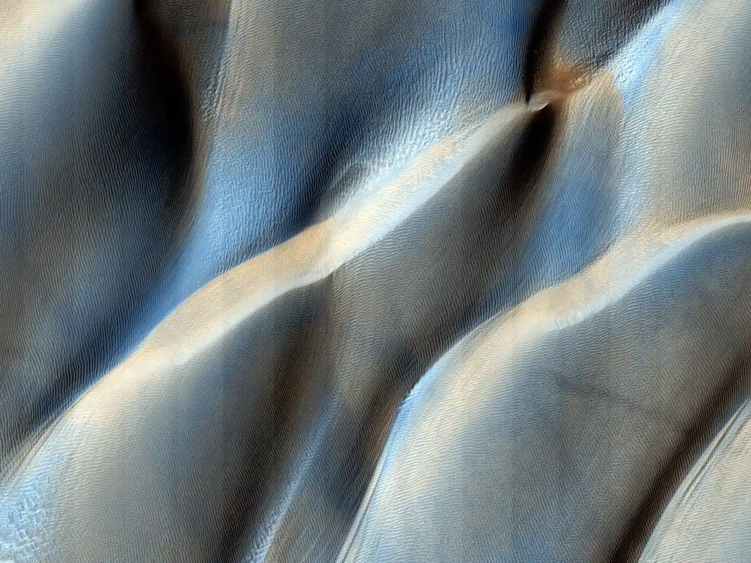 Это во время марсианской зимы, двуокись углерода вымерзает из воздуха. Летом СО2 сублимирует, то есть переходит из твердого состояния в газ. Когда это происходит, песок возмущается и падает вниз по склонам в образующиеся маленькие каналы, которые расширяются, когда он падает на дно. Это возмущает красную пыль, которая течет вместе с песком. После всего этого возникают те самые перистые усики.