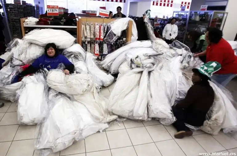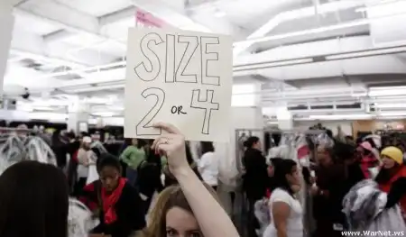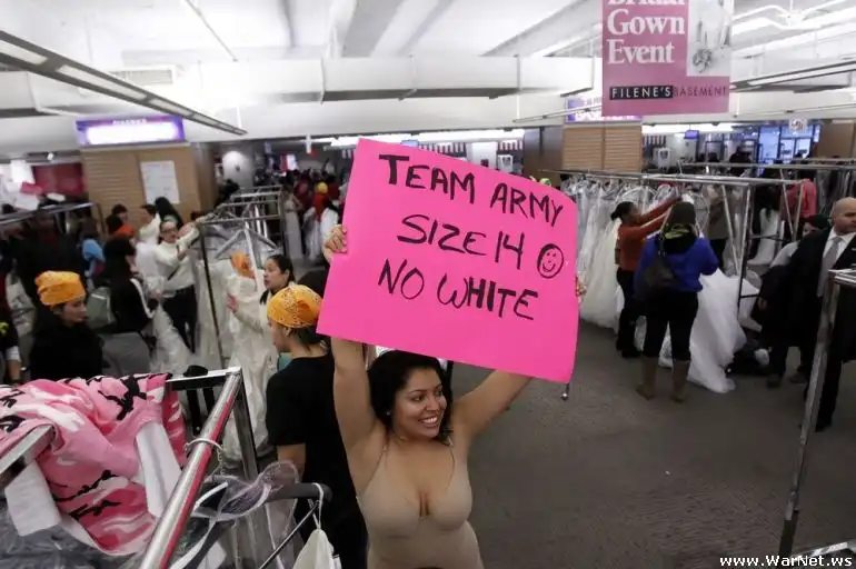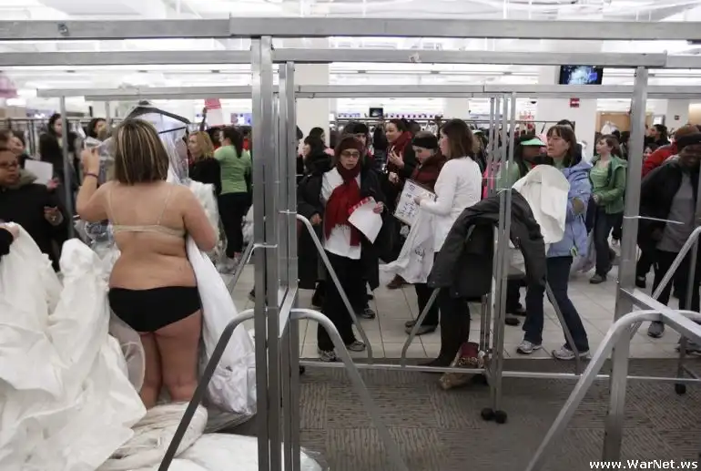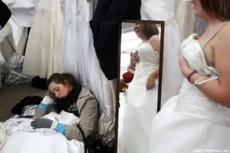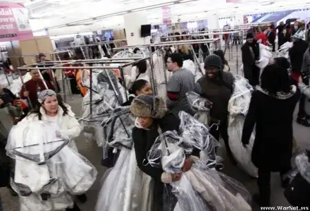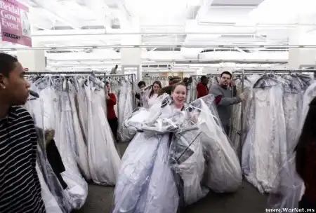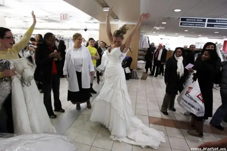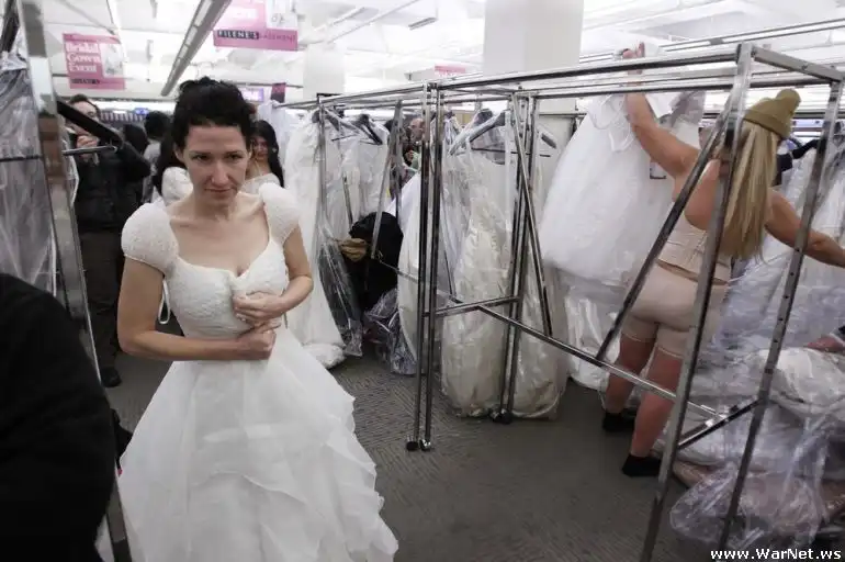 В Нью-Йорке состоялся забег за свадебными платьями Running of the Brides. Сотни девушек приехали для этого в мегаполис со всей страны — из Техаса, Флориды и Нью-Джерси. Перед открытием у дверей магазина образовалась внушительная очередь. Невесты подбадривали друг друга песнями и делились советами, как провести торжество, после чего с криками ринулись к прилавкам. В считанные минуты все вешалки опустели. Размер не имел никакого значения, будущие жены полагались на удачу. Те, кому наряд пришелся в пору, радостно позировали и плакали от счастья, остальные же писали таблички с объявлениями, чтобы поменяться. Поведение девушек понятно — наряды от известных дизайнеров, которые стоят тысячи долларов, в этот день отдавали всего за $250.