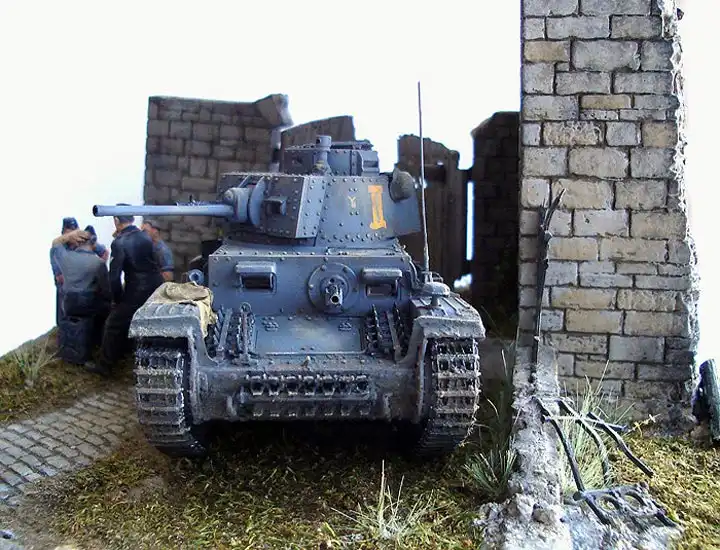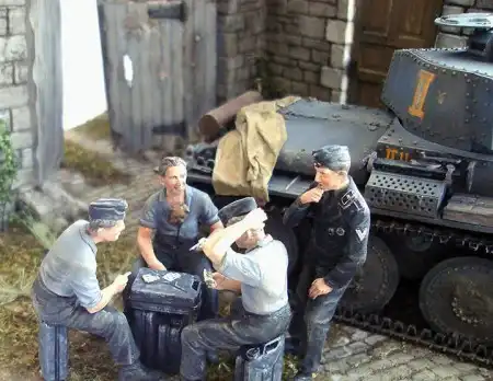 На диораме показан сюжет, изображающий немецких танкистов из 8-й танковой дивизии, остановившихся после очередного марш-броска в маленькой прибалтийской деревушке у развалин дома, пострадавшего от прямого попадания артиллерийского снаряда. После заправки своего танка Panzer 38(t) Ausf.E Praga, имея несколько минут свободного времени, танкисты решили сыграть партейку в карты. Любимой игрой в карты у немецких солдат была игра "Скат". Они и не догадываются, что уже в совсем скором будущем у них на такие развлечения не будет ни времени , ни желания, ни сил...