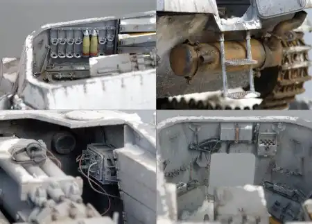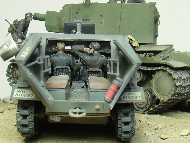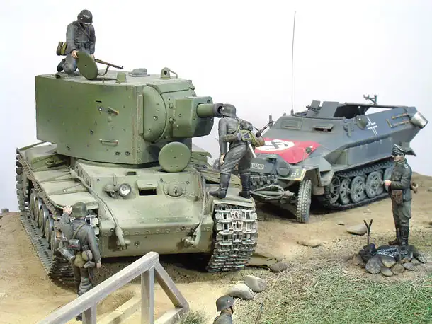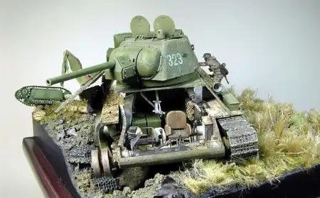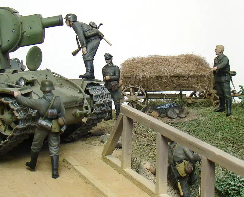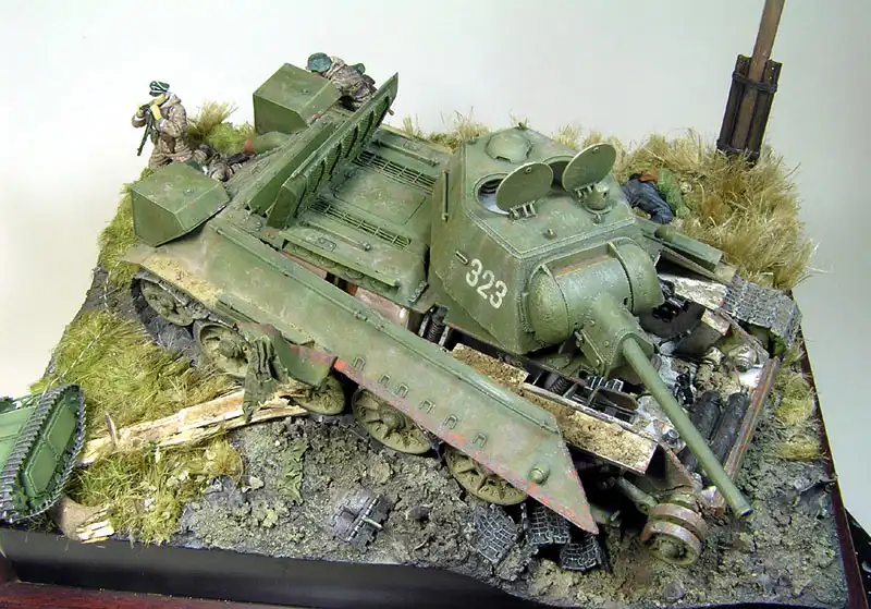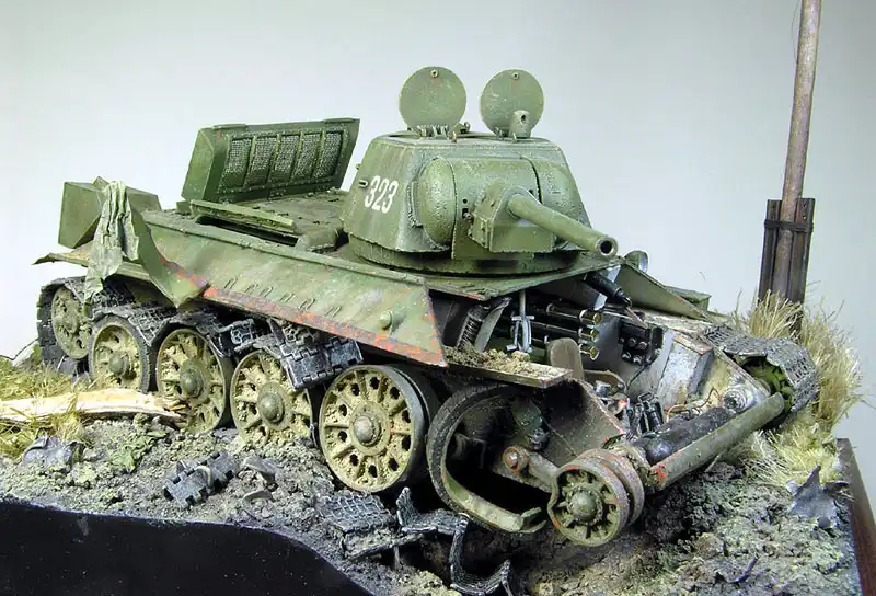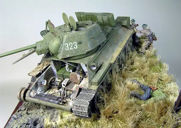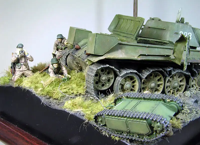 Основой для диорамы послужила довольно известная фотография Т-34,подорвавшегося на фугасе. Мощный взрыв разворотил ходовую и вырвал лобовой лист, но на удивление при этом обошлось без пожара или детонации боекомплекта. В результате получился почти целый танк с хорошо видимым интерьером. Радиста и механика-водителя вынесло взрывной волной и они, очевидно, погибли; а вот те, что были в башне, выбрались сами. Об этом говорят открытые, а не сорванные с петель люки.