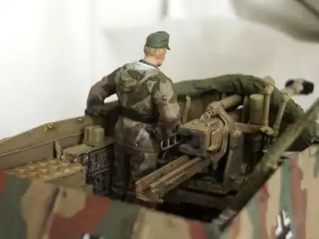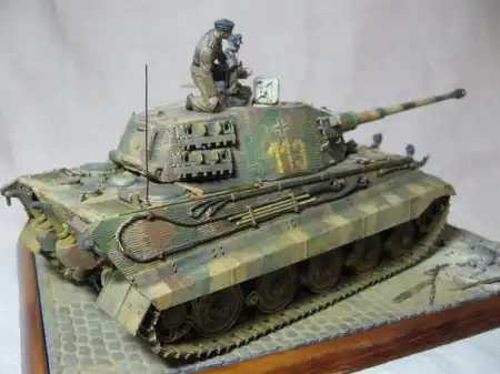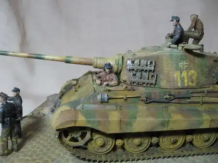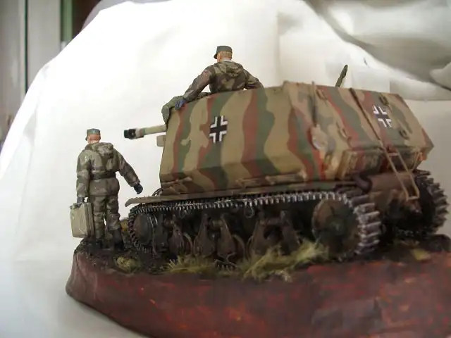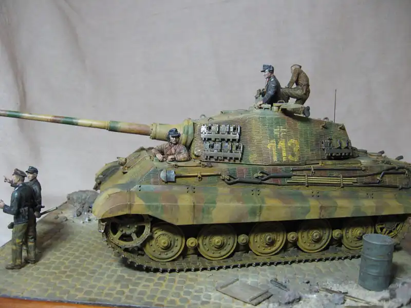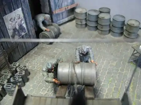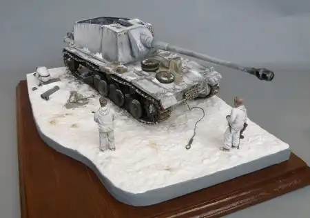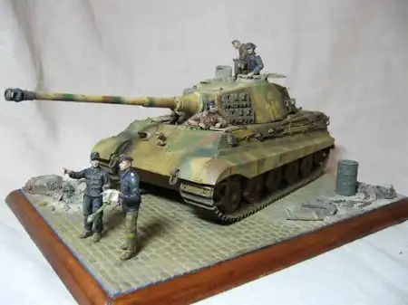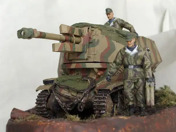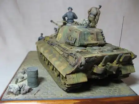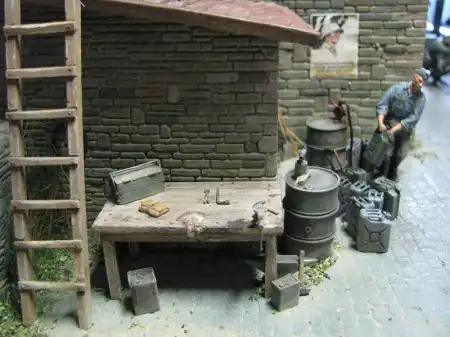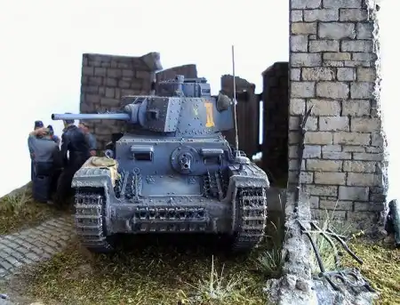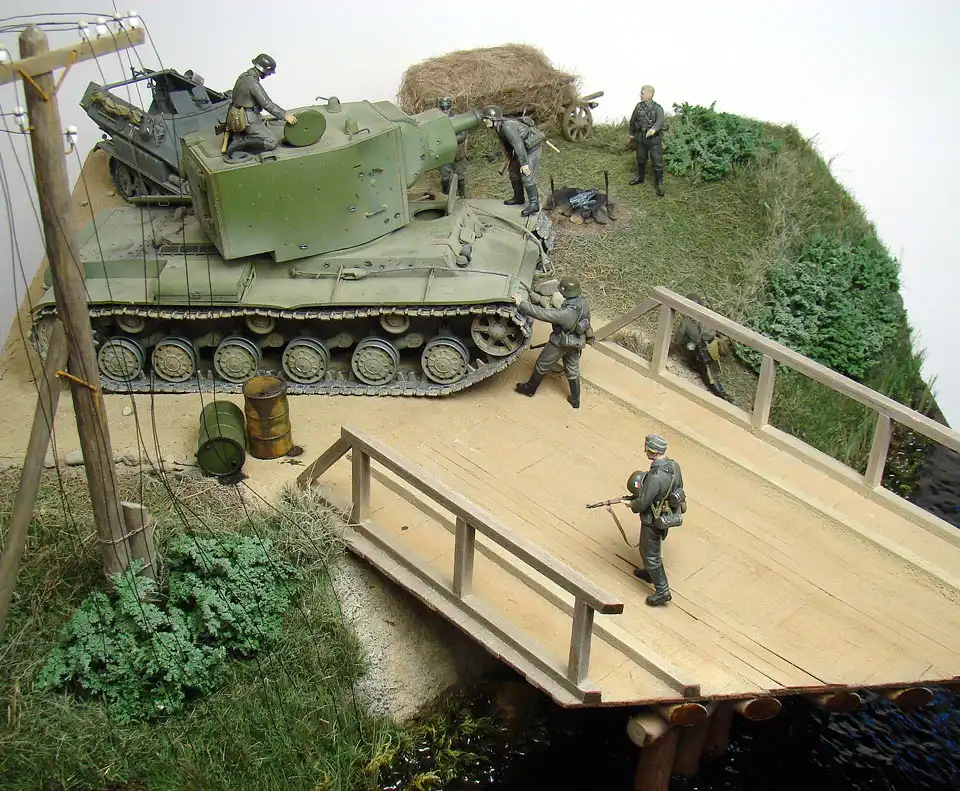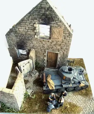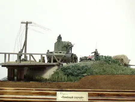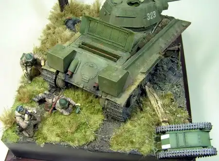 Рядом расположена самодельная фигурка погибшего танкиста. За танком укрылись трое фашистов (доработанные пулеметчики от МВ), направляющие самоходную мину "Голиаф" на очередную жертву. Диорама не имеет конкретной исторической привязки.