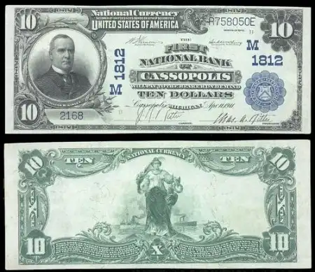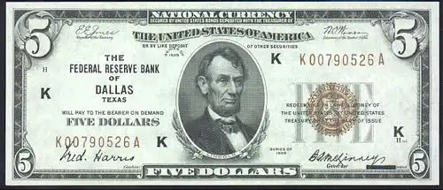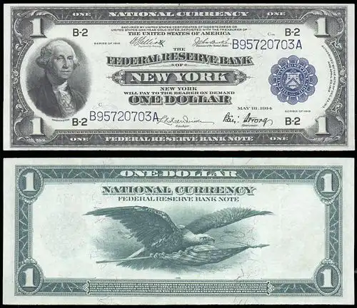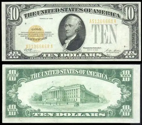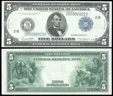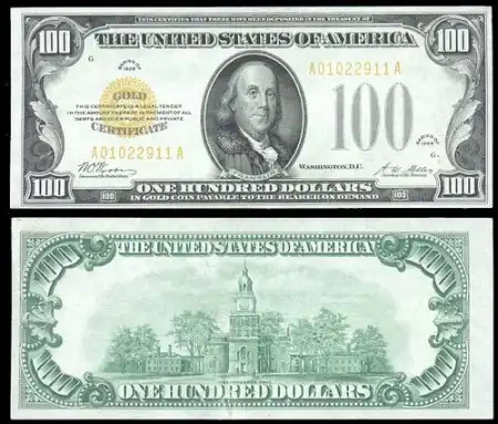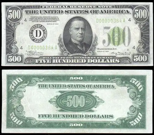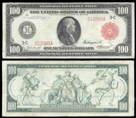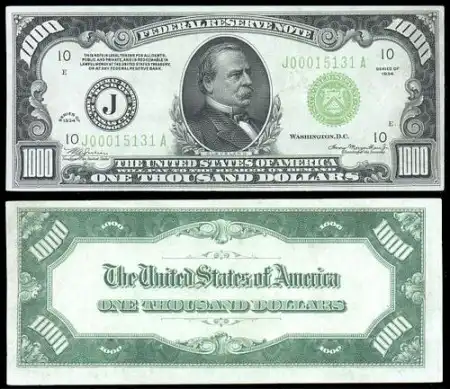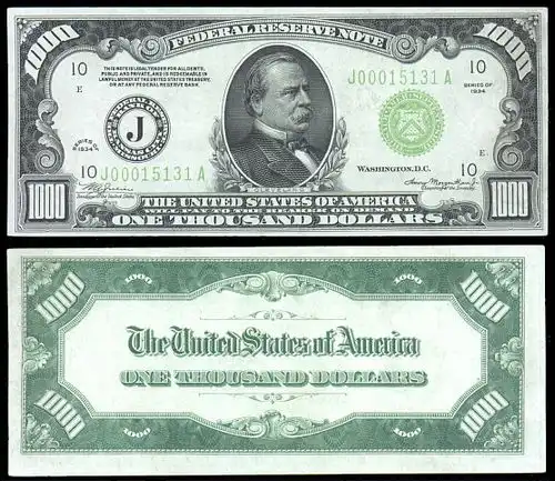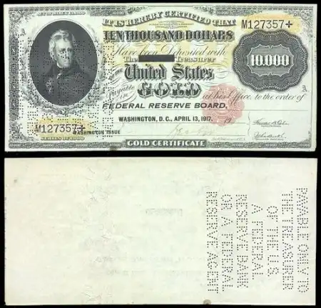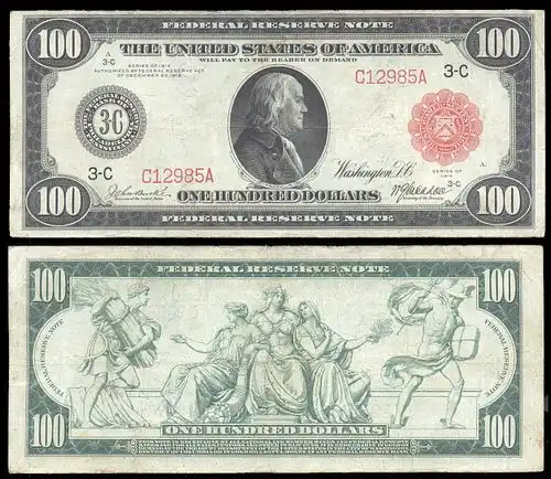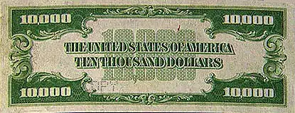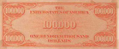 Самая крупная американская банкнота имеет номинал 100 000 долларов. На ней изображен Вудро Вильсон (1856-1924), 28-й президент США (1913-1921), один из авторов Версальского мирного договора и устава Лиги Наций, лауреат Нобелевской премии мира в 1919 г. В обращении находится только 42 тысячи таких банкнот. Они используются исключительно в официальных расчетах и лишь в стенах федеральных резервных банков.серия 1934 г.