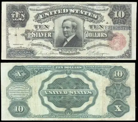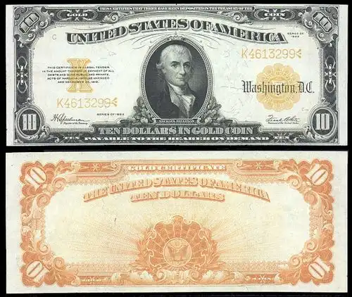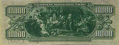 На банкноте достоинством в 10 000 долларов - портрет Сэмюэля Чейза (1741-1811), одного из политических деятелей, подписавших Декларацию независимости, министра финансов при президенте Линкольне, председателя Верховного суда с 1796 по 1811 г.серия 1918 г.