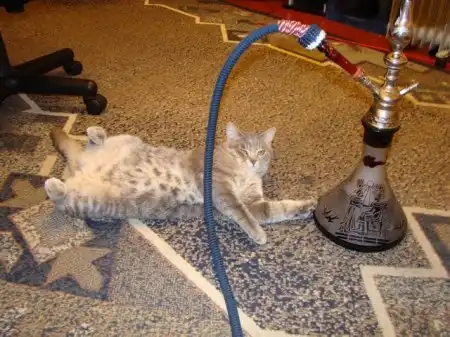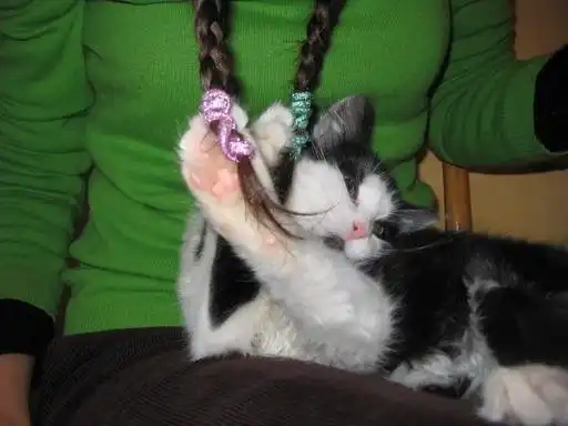 Кошка Сергея Овчинникова играет с косичкой хозяина.