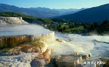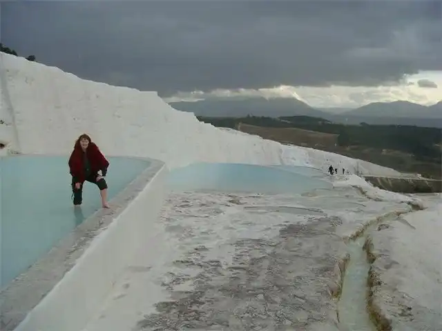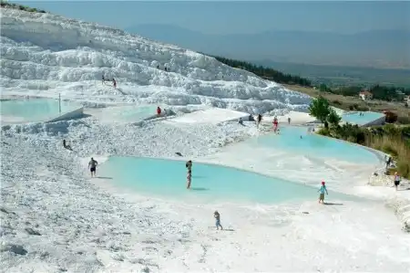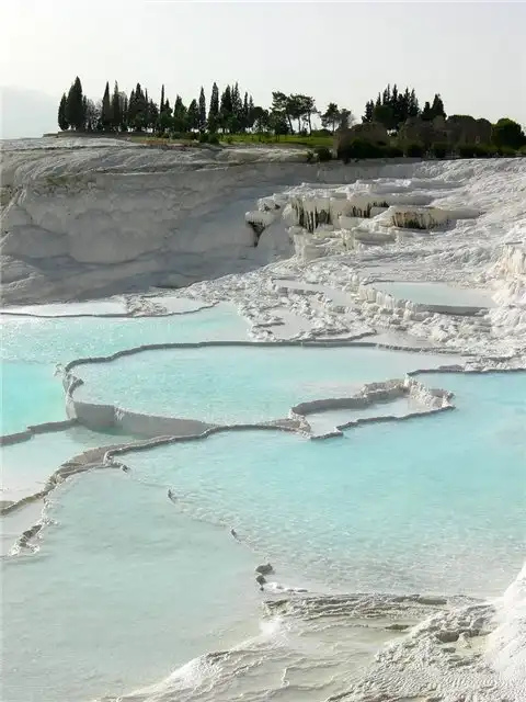 Памуккале «хлопковая крепость» — термальные источники (температура 30 °C) в Турции. Вода, стекающая со склонов горы образует систему причудливых водоёмов с известняковыми стенами (травертинами). Ослепительно белые террасы (травертиновые образования) возникли на склоне горы в результате отложения солей из насыщенных кальцием источников.