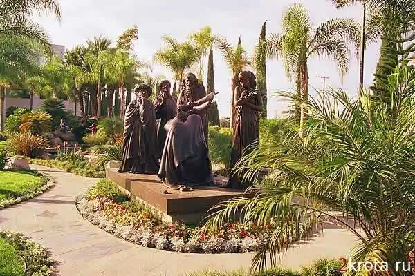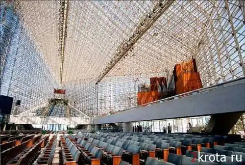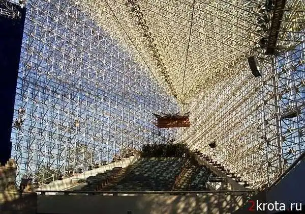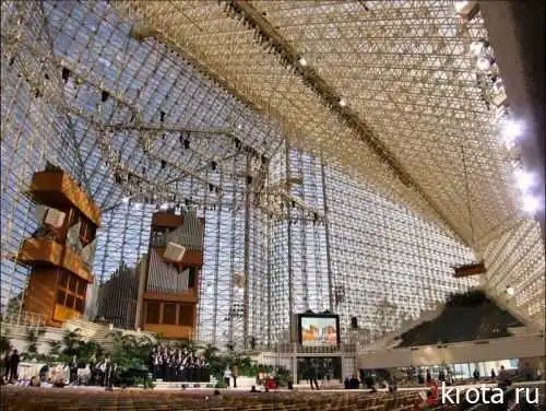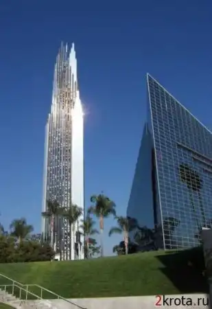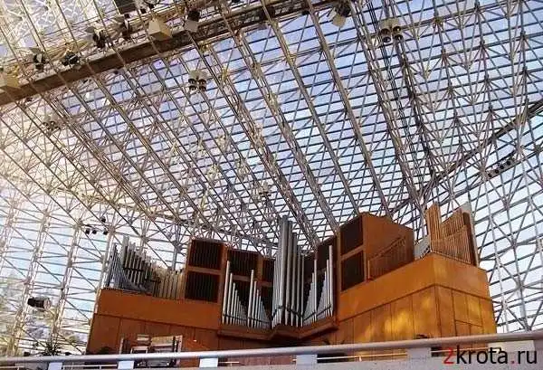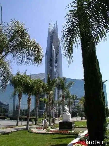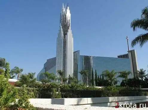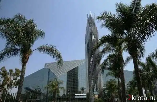 Это самая голливудская церковь в мире и одновременно самое большое сооружение из стекла. И название ему – Хрустальный Собор (The Crystal Cathedral). Собор построен из более 12000 кусочков зеркального стекла, соединенного серебристой металлической конструкцией, острый шпиль невероятной колокольни устремляется в небо, дополняет фантастическую картину небольшое озерцо, окруженное зеленью газона, в которое упирается здание одним из своих острых углов. А еще внутри установлен самый крупный в мире орган, в котором более 16 тысяч труб. Собор был освящен в 1980 году Преподобным Робертом Шуллером (Robert Schuller), который известен в США как пастор первой в Калифорнии «drive-in» церкви. Можете себе представить огромную парковку, заполненную автомобилями с прихожанами и священника, проповедующего с крыши?..