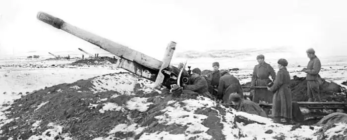 Батарея дальнобойных орудий готова к огневому налету. 1943 г