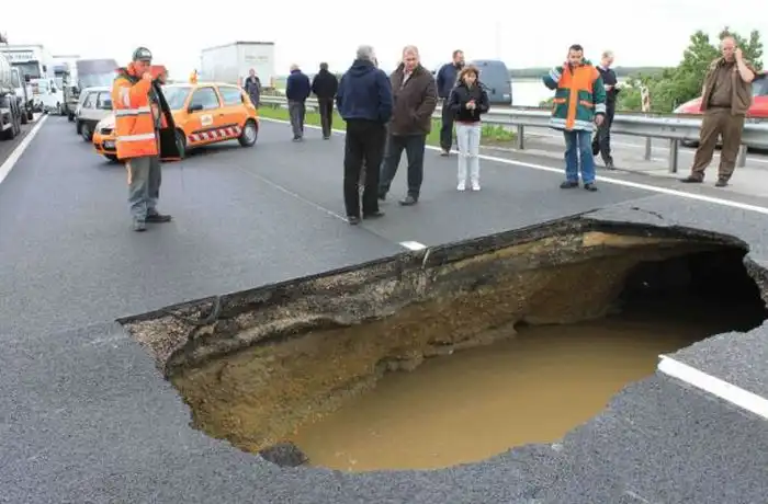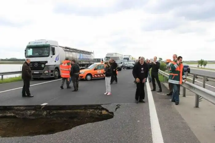 Большая дыра появилась на трассе M1 в Венгрии.Эта дыра на дороге стала причиной сразу нескольких аварий.