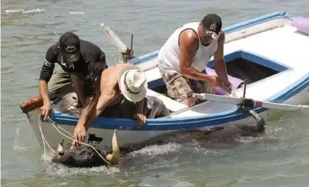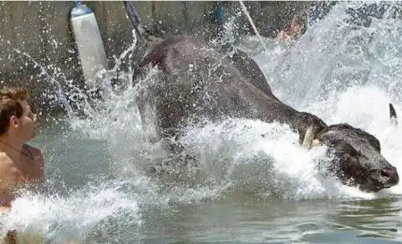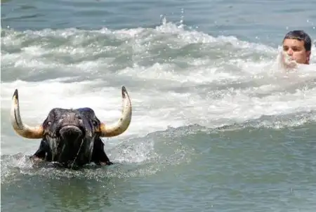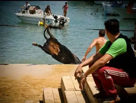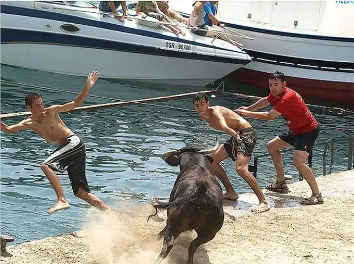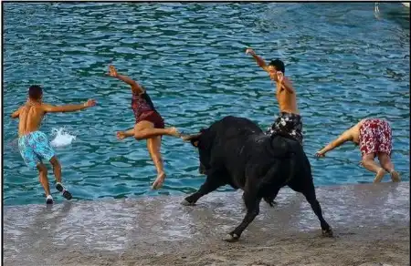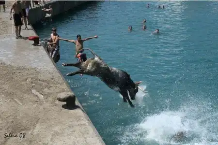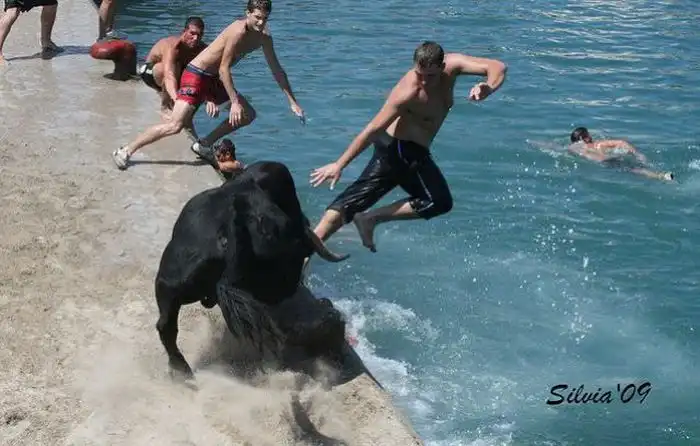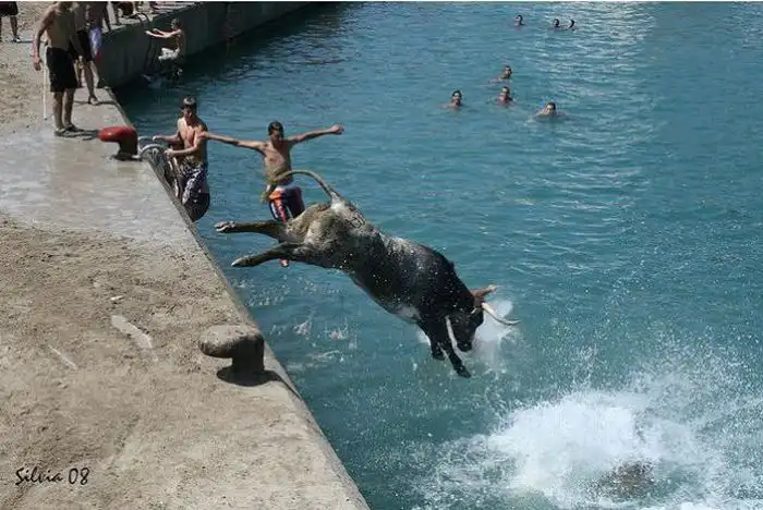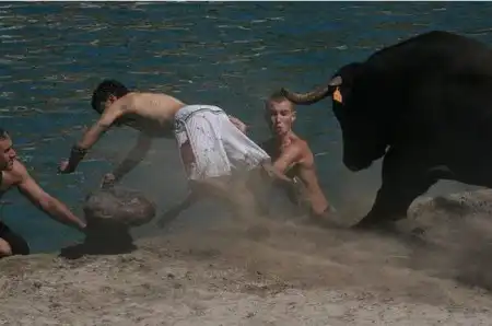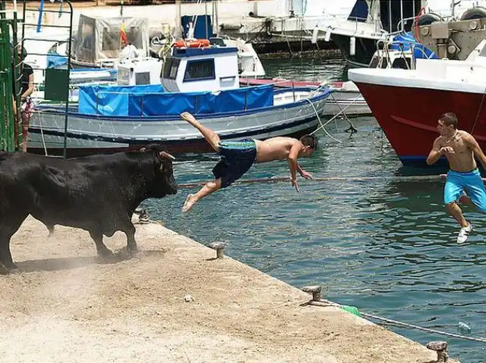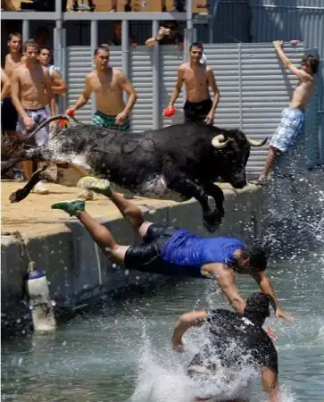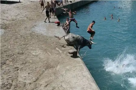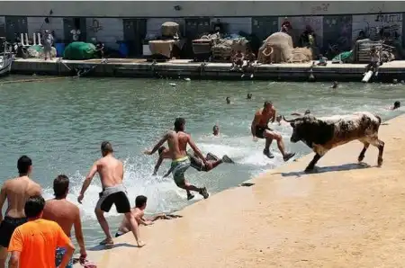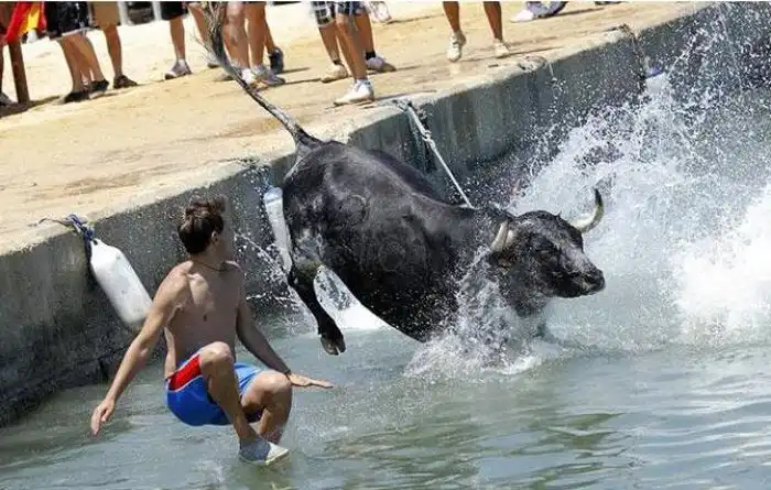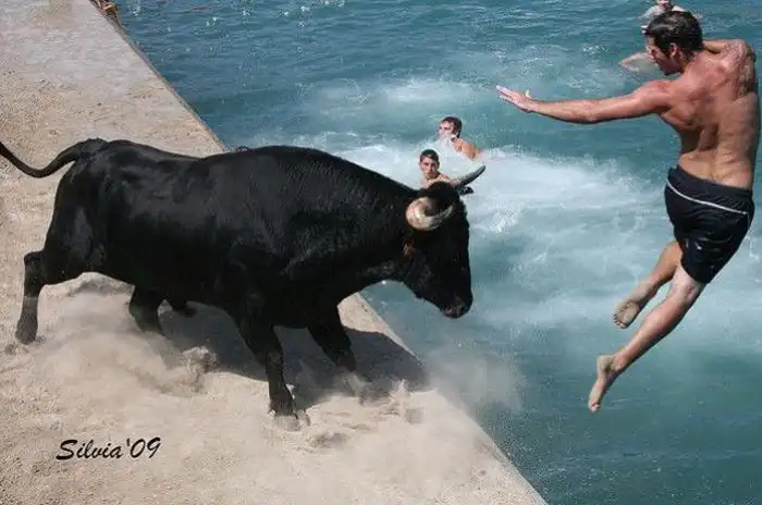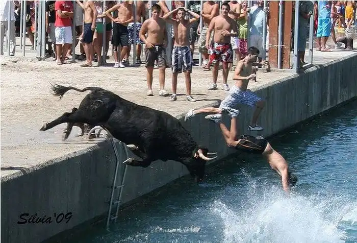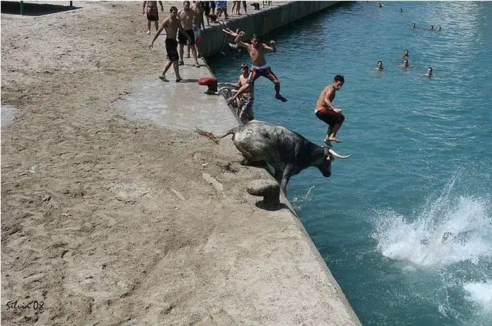 Коррида в Испании возможно и закончилась бы для некоторых особо смелых парней печально.Но близость воды спасла многих, хотя и у них были опасные моменты.
