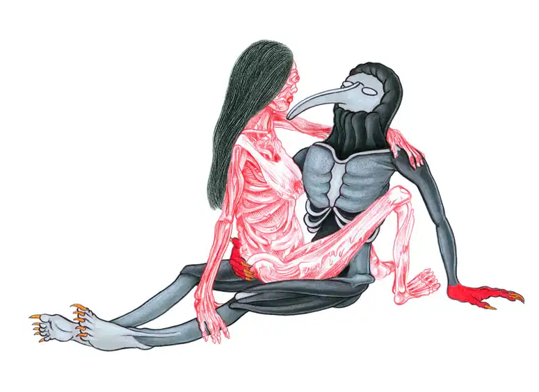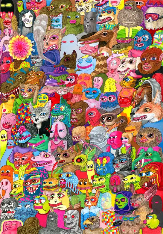 Катание на BMX, танцующие зомби, выблевывающие собственные внутренности вместе с головой, раскраска под кубик-рубика в различных вариациях, вандализм в городских джунглях, модные аксессуары на монстрах, женская грудь, красота и много-много животных: полулюдей-полумутантов – в картинах Мэтта смело, но при этом чрезвычайно гармонично перемешано множество сюжетов и деталей.