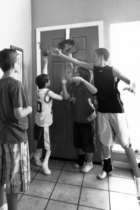 Это отличная альтернатива игре на свежем воздухе - мальчики сняли обувь и играют маленьким мячом.