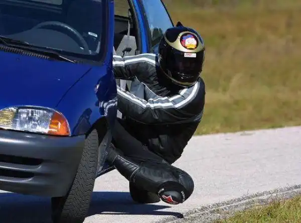 Свешиваются чтобы уменьшить угол наклона мотоцикла, чтобы подвеска лучше работала. А колено выставляют для контроля угла наклона.