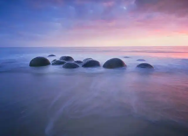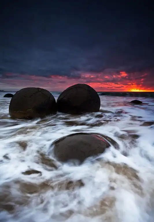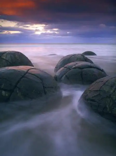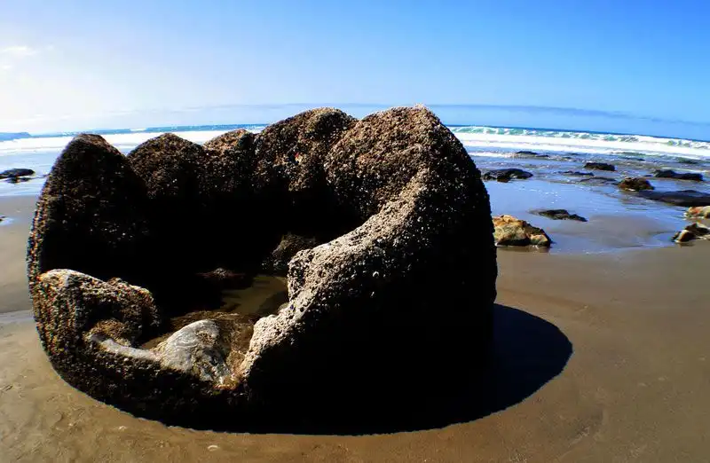 В Новой Зеландии есть валуны почти идеальной сферической формы, большинство в диаметре от 1,5 до 2, 2 метра. Находятся и в море и далеко от береговой линии. Возраст их оценивают в 60 млн. лет. Структура камней различна – от полной гладкости до шероховатости и трещин. Некоторые раскололись и можно наблюдать их красочные кристаллические внутренности.