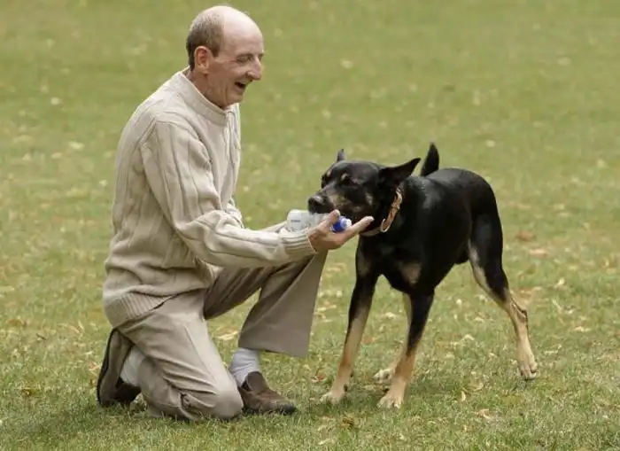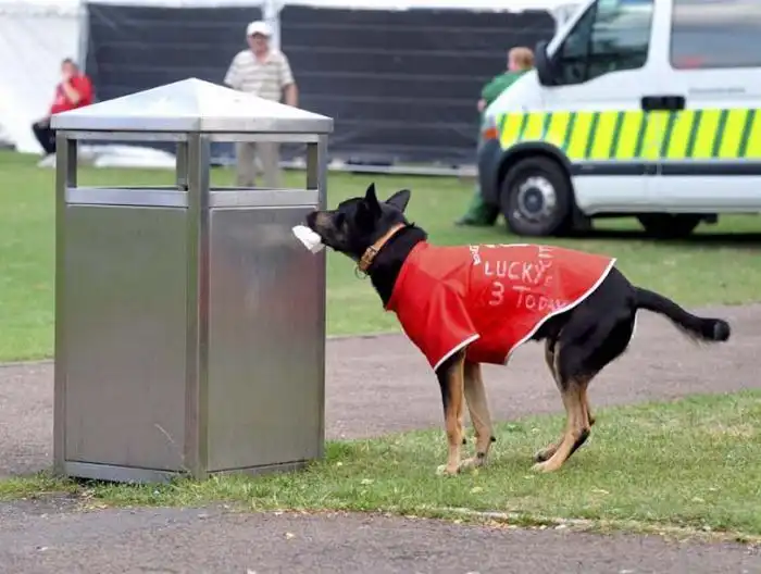 Очень хорошая идея натренировать собаку, чтобы она складывала мусор в урну. Смотрите, как она ловко это делает.