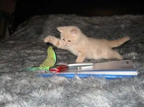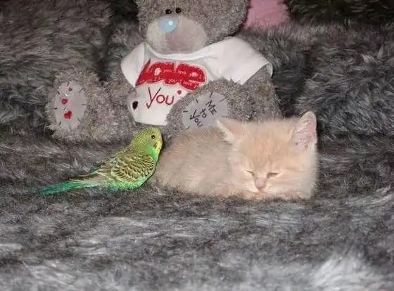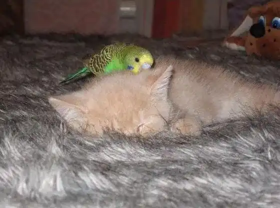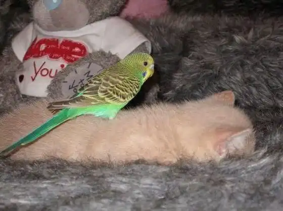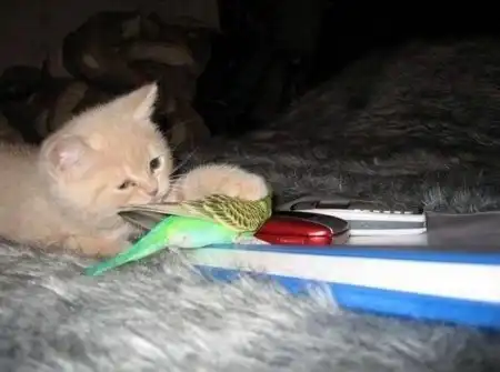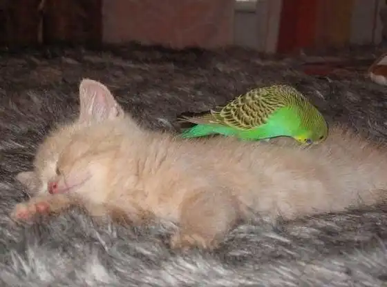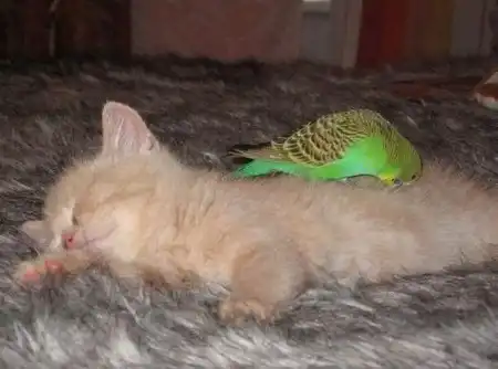 через пару лет кошак схамячит этого папугая... люди именно так и поступают в детстве дружба не разлей вода а подрастут предадут за рубль...
