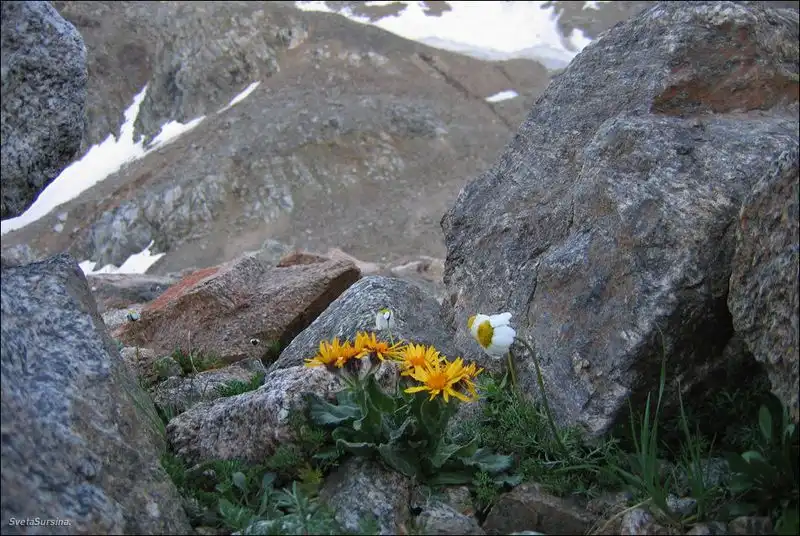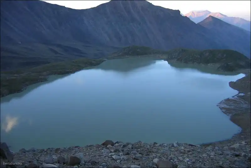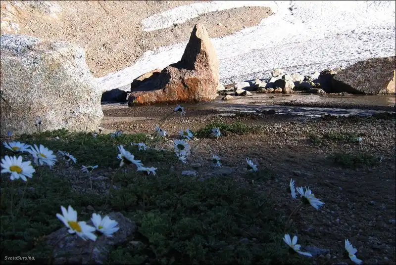4. Выполаживание, решили переночевать, и утром ну нас, как романтично пишет один из очевидцев: Прямо перед вами гигантский массив разрушенных скал. Это древний ледниковый порог, перегораживающий верховья долины - естественная плотина, образующая озеро Сылтран-кель. Среди каменного лабиринта без гида не обойтись. Река, вытекающая из озера, течет в глубоком каньоне, и на выходе из него отвесные стены настолько сужаются, что проход не виден даже с очень близкого расстояния. Огромный водопад усиливает впечатление от буйной водной карусели. Часовой слалом сквозь нагромождения мореных гряд, и вот вы перед уникальным малоизвестным сокровищем горного царства...Здесь на высоте более 3000 м над уровнем моря в окружении хоровода великолепных каменных исполинов застыла огромная водная чаша - знаменитое высокогорное озеро - Сылтран-кель - площадью около 10 гектаров. Тишина и покой, полные умиротворения, господствуют на ее диких берегах. Лишь слышно журчание воды, вытекающей из озера и прогрызающей путь среди каменного хаоса. Скалистые берега, яркие цветы в трещинах скал, плавающие по озеру в начале лета айсберги, близость снежных вершин и Эльбруса придают этому месту суровое очарование. Явно поэт в душе...