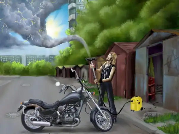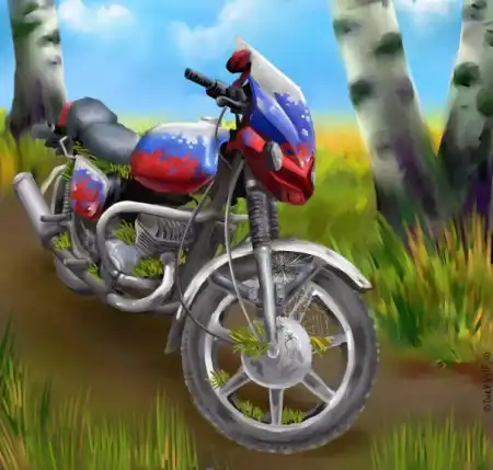 "... поехали мы, с отцом в деревню, значит, а это километра 3 от кордона. А! Мотоцикл еще! Это был уникум! Я такого не видел никогда! Значит, во-первых, он был трехцветный, потому что его красили три раза и все три раза краска облезала... Во-вторых, в нем вообще не было тормозов. То есть, отца однажды когда поймали менты, они ничего отцу не сделали, но они два часа его не отпускали -- они гоняли этот мотоцикл взад-вперед и не понимали, как на нем вообще можно ездить. На нем росла трава, потому что забивалась во все щели -- и выросла! Отец ее принципиально не уничтожал. И наконец -- там жили несколько пауков-крестовиков, которые сплели на нем вот такого размера круглые паутины. И переливаясь, значит, всеми этими радужным флагами, это приспособление двигалось!!! Оно -- мотоцикл-рекордсмен, потому что за водкой на нем выезжало одновременно одиннадцать человек!" (с) Сергей Калугин, истории из жизни.