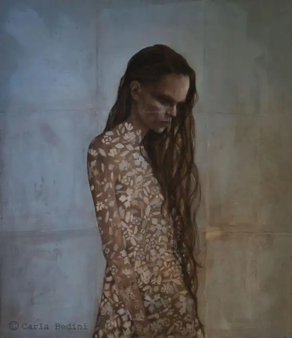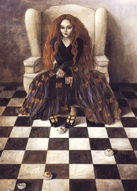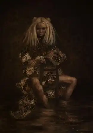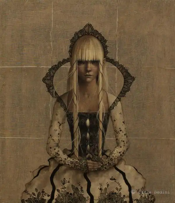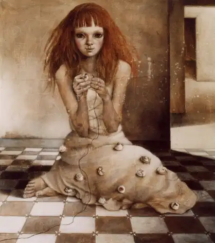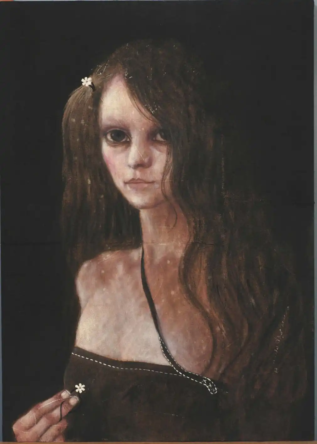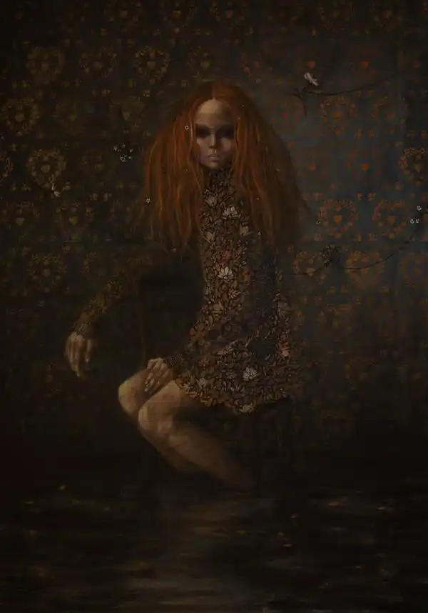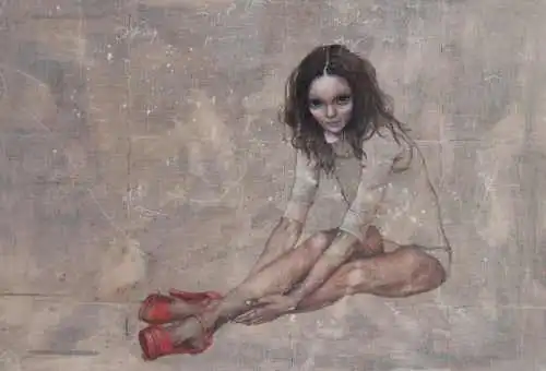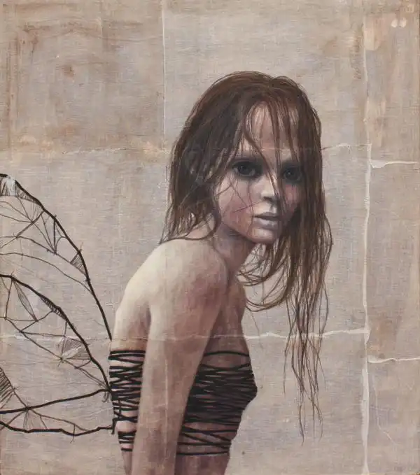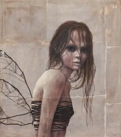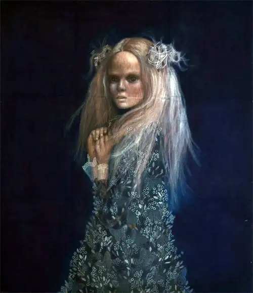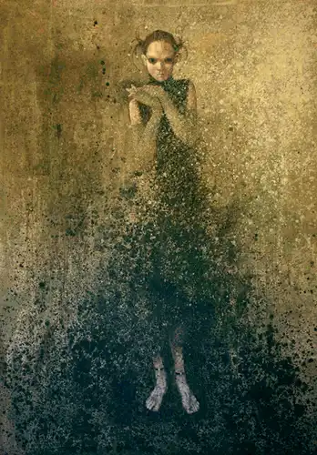 Её картины, созданные на обыкновенной медицинской марле, изображают странных болезненно-хрупких девочек. Анорексичные Офелии, всплывшие со дна, смотрят на мир неживыми глазами, пустыми и тёмными, как пузыри на болотной воде.