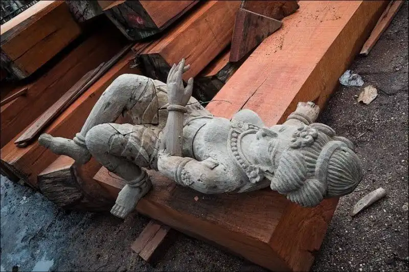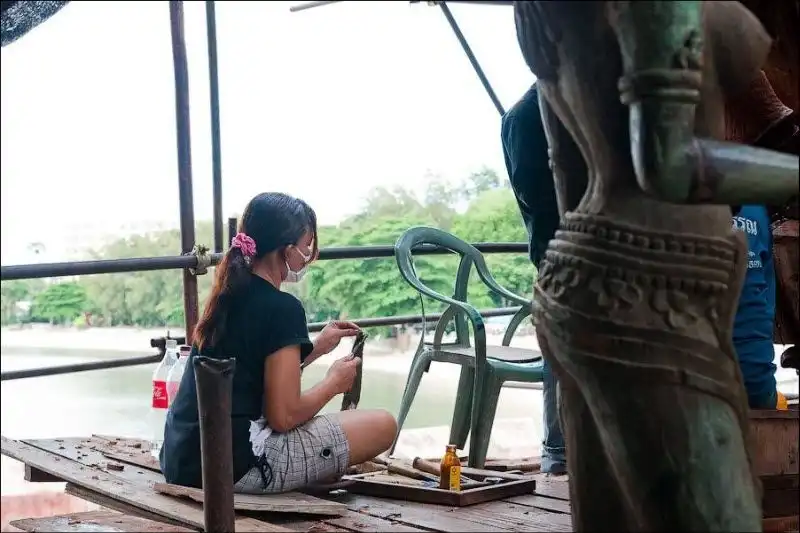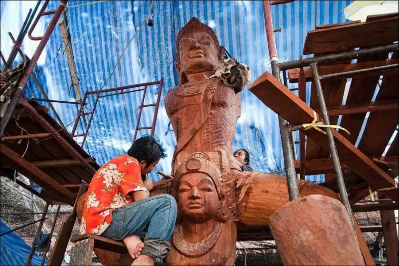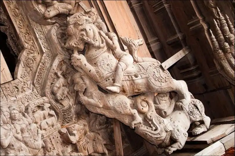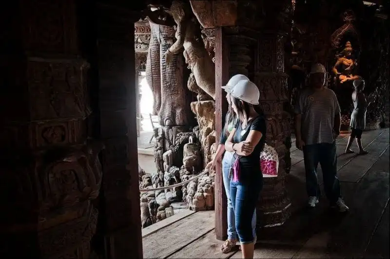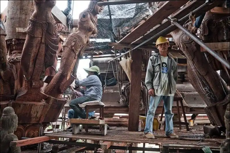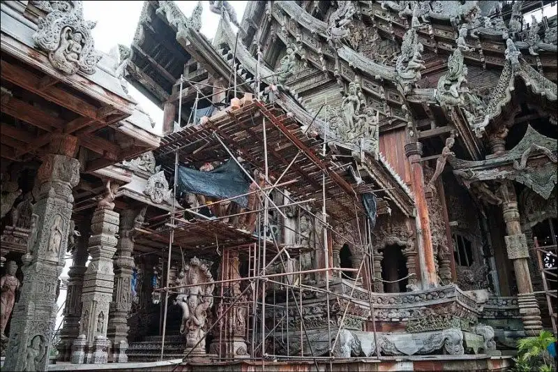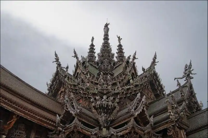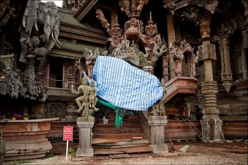 Храм Правды начал строить на собственные средства эксцентричный тайский миллионер Лек Вирийапхан 1981 году. По легенде, ему нагадали, что он умрет как только достроит храм. Случилось это через 19 лет, а храм все еще строится, уже три десятилетия. "Сделанное целиком из дерева и покрытое тонкой резьбой, это здание наполнено религиозной и философской истиной и показывает, чего достигла человеческая цивилизация", - написано в рекламном проспекте. Действительно так. Одни части храма уже гниют тридцать лет под открытым небом, другие строятся, третьи реставрируются - уменьшенная копия человеческой цивилизации.