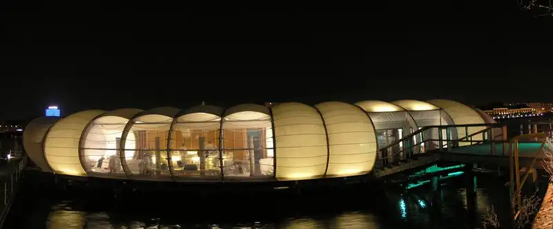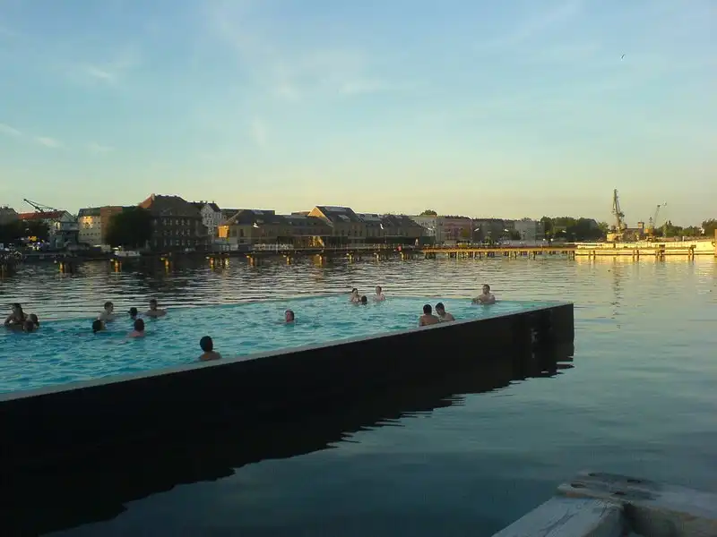 Вот такой водный парк с видом на залив. На зиму пантоны накрывают, чтоб можно было поваляться позагорать и попить различных напитков. Бассейны всегда подогревают, так что парк работает всегда)