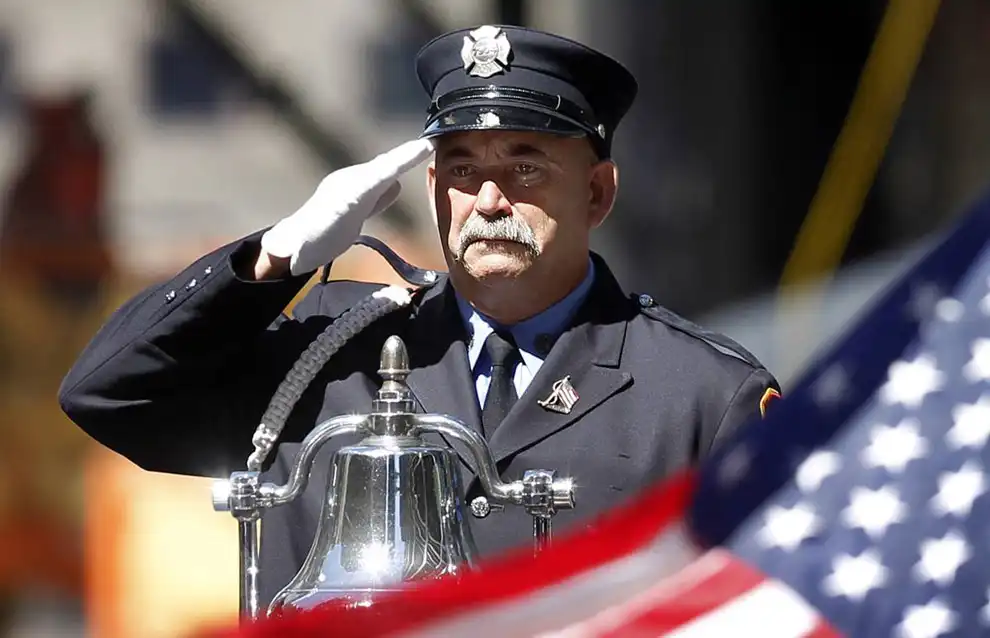 Пожарный отдаёт честь под барабанную дробь перед минутой молчания в память о жертвах терактов 11 сентября 2001 года в парке Зуккотти в Нью-Йорке.