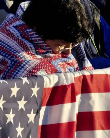 Участница церемонии кутается в одеяло, чтобы согреться на рассвете в Шанксвилле, Пенсильвания. В тот же день первая леди Мишель Обама и бывшая первая леди Лора Буш выступили с обращением к народу.