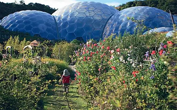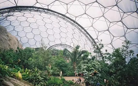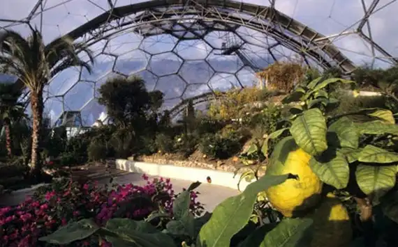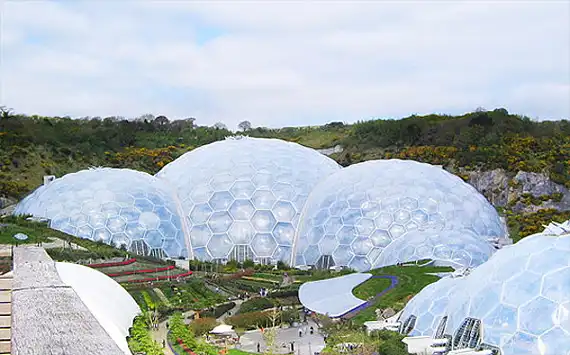 Оранжерея Eden Project находится на полуострове Корнуолл, на юго-западе Англии. Комплекс расположен на месте бывшего глиняного карьера и состоит из 5 прозрачных биомов. Ботанический сад включает около 1000 000 растений, посаженных в соответствии с определенной климатической зоной. Купола оснащены системой сбора дождевой воды и частичным питанием энергией ветра.