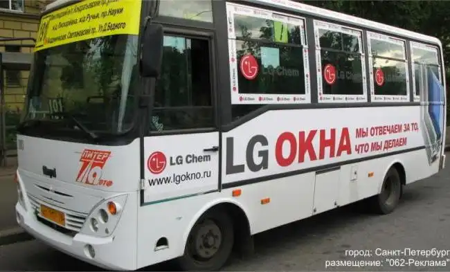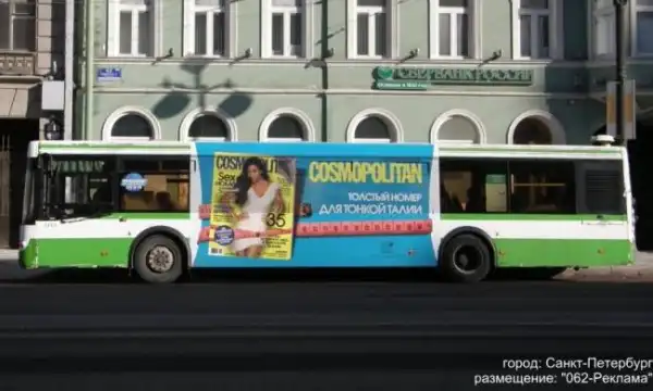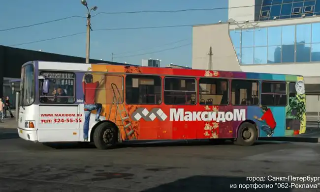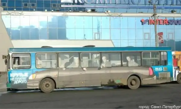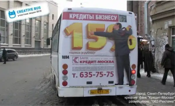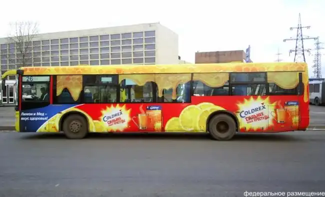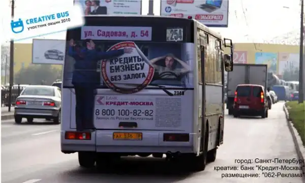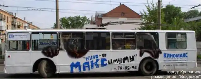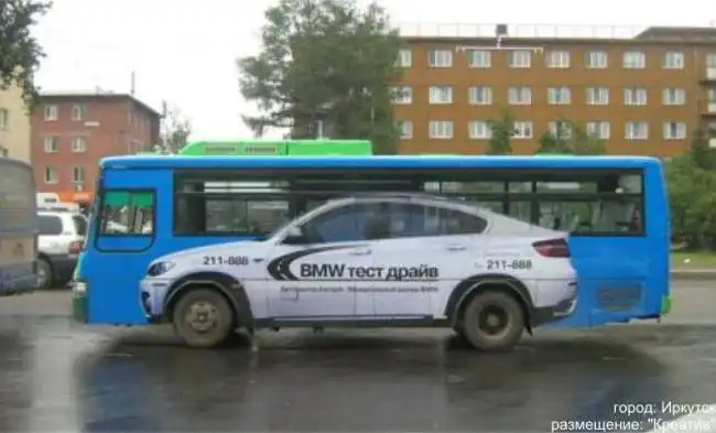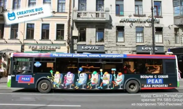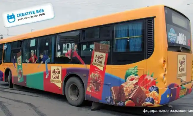Довольно распространенным в России является прием «автобус-машина», превращающий газель в кабриолет, а троллейбус в гоночный болид. На втором месте — нарисованные и недорисованные пассажиры. Достаточно автобусов «в камуфляже» (скорая помощь, защитная форма, автобус, оклеенный обоями), а также много проектов, где автобус — часть вербальной составляющей макета: «15 мест для пассажиров с кариесом», «с нашего дивана вы не пересели бы в автобус», «автобус не резиновый» и другие.