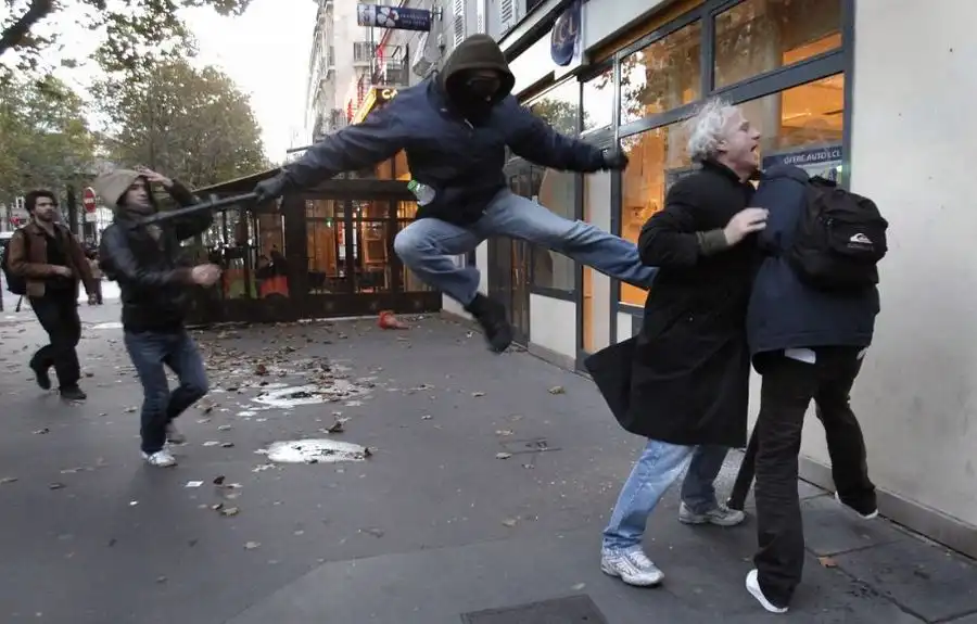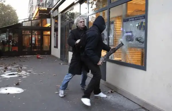 Видел этот момент по ТВ. Один придурок бьёт витрину, прохожий пытается его образумить и тут еще одна тварь прыгает на этого прохожего.