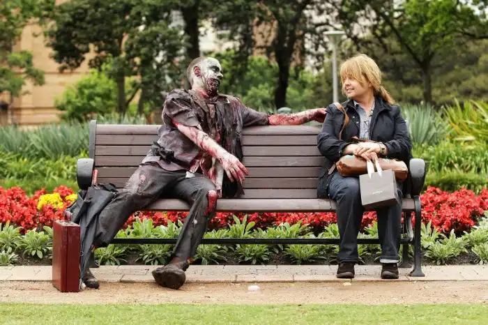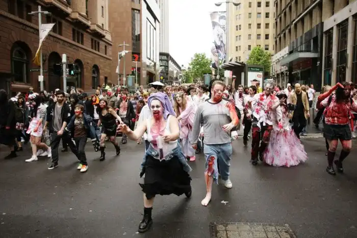 Каждый год в Мельбурне(Австралия) проходит зомби-парад. В этом мероприятии принимают десятки людей, которые носят страшные костюмы и макияж зомби. Участники парада терроризируют улицы Мельбурна, пугая прохожих. Причем костюмы и гримм их выглядят очень реалистично, и возможно даже реалистичнее, чем во многих фильмах.