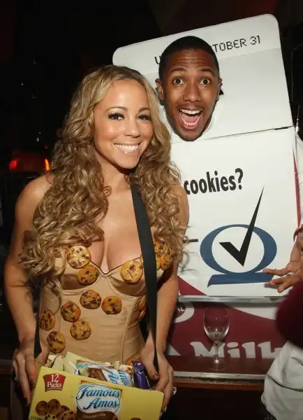 13. Мэрайя Кэри и ее муж Ник Кэннон стали ведущими вечеринки Хэллоуин 2008, вырядившись как настоящая пара – в костюмы печенья и молока! (InStyle.com)