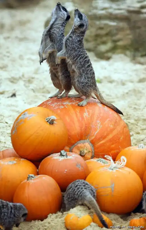 Сурикаты и тыква в парке развлечений в Милнторпе, Камбрия.