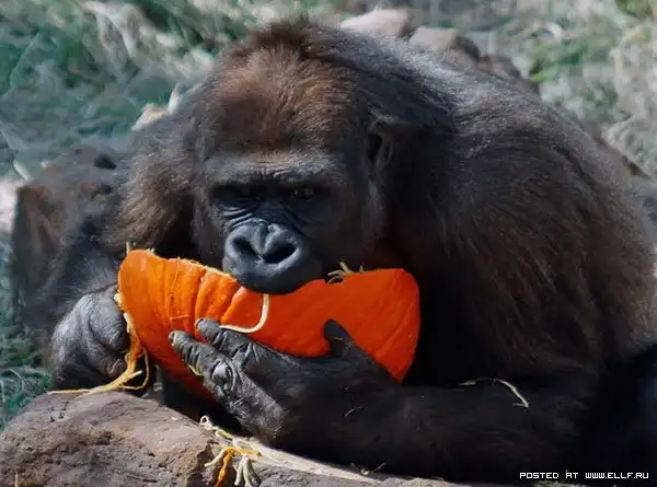 Детеныш западной равнинной гориллы кушает тыкву в зоопарке Вашингтона.