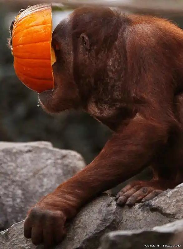 Самка орангутанга играет с тыквой в зоопарке Ганновера.
