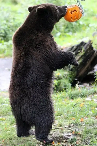 Бурый медведь осматривает тыкву в зоопарке Блэйра, Шотландия.
