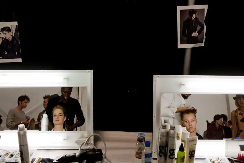 6. Перед началом показа Concept Korea за кулисами царит традиционная суета. Парикмахеры и гримеры сбились с ног. Следующей весной особо актуальной прической будет простой и удобный конский хвост или же можно свернуть волосы в тугой узел.