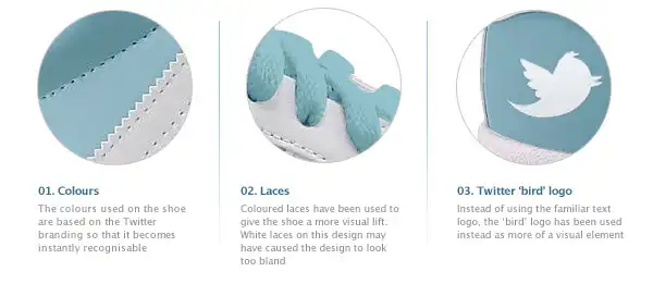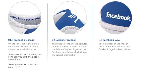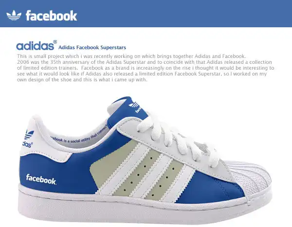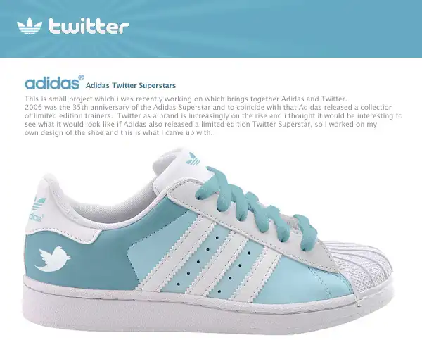 Социальные сети не прекращают вдохновлять дизайнеров и творческих личностей всего мира. Вот наконец появилась и обувь, посвященная двум самым популярным социальным сетям в настоящее время - твиттеру и фейсбуку. "Adidas Twitter Superstars" и "Adidas Facebook Superstars" - две пары сникерсов, представленные иллюстратором и графическим дизайнером Джерри Маккем (Gerry Mckay), который живет и работает в Глазго.