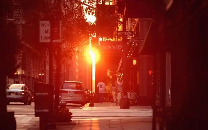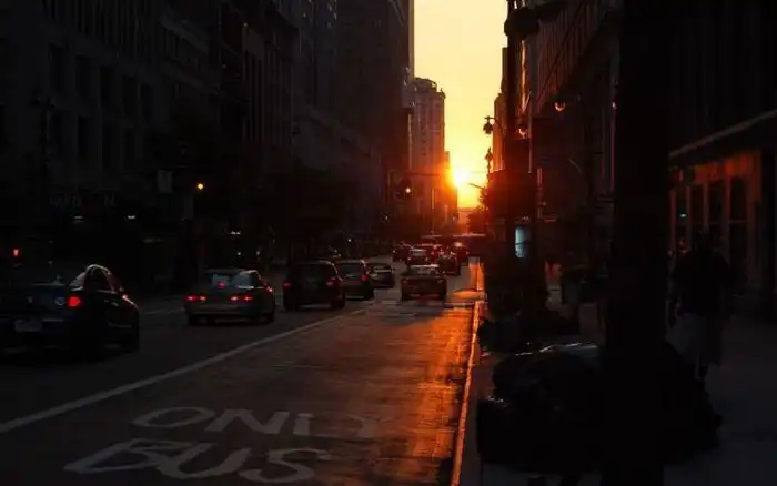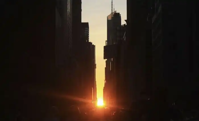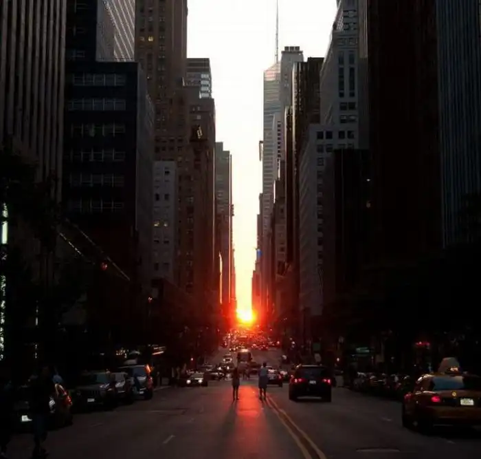 Во время Манхэттенского Стоунхенджа солнце садится ровно вдоль разделительной стороны каждой улицы, небоскребы обычно скрывают солнце и поэтому создается впечатление, что весь город буквально залит светом. Это явление можно наблюдать два раза в год, в дни весеннего и осеннего равноденствия.