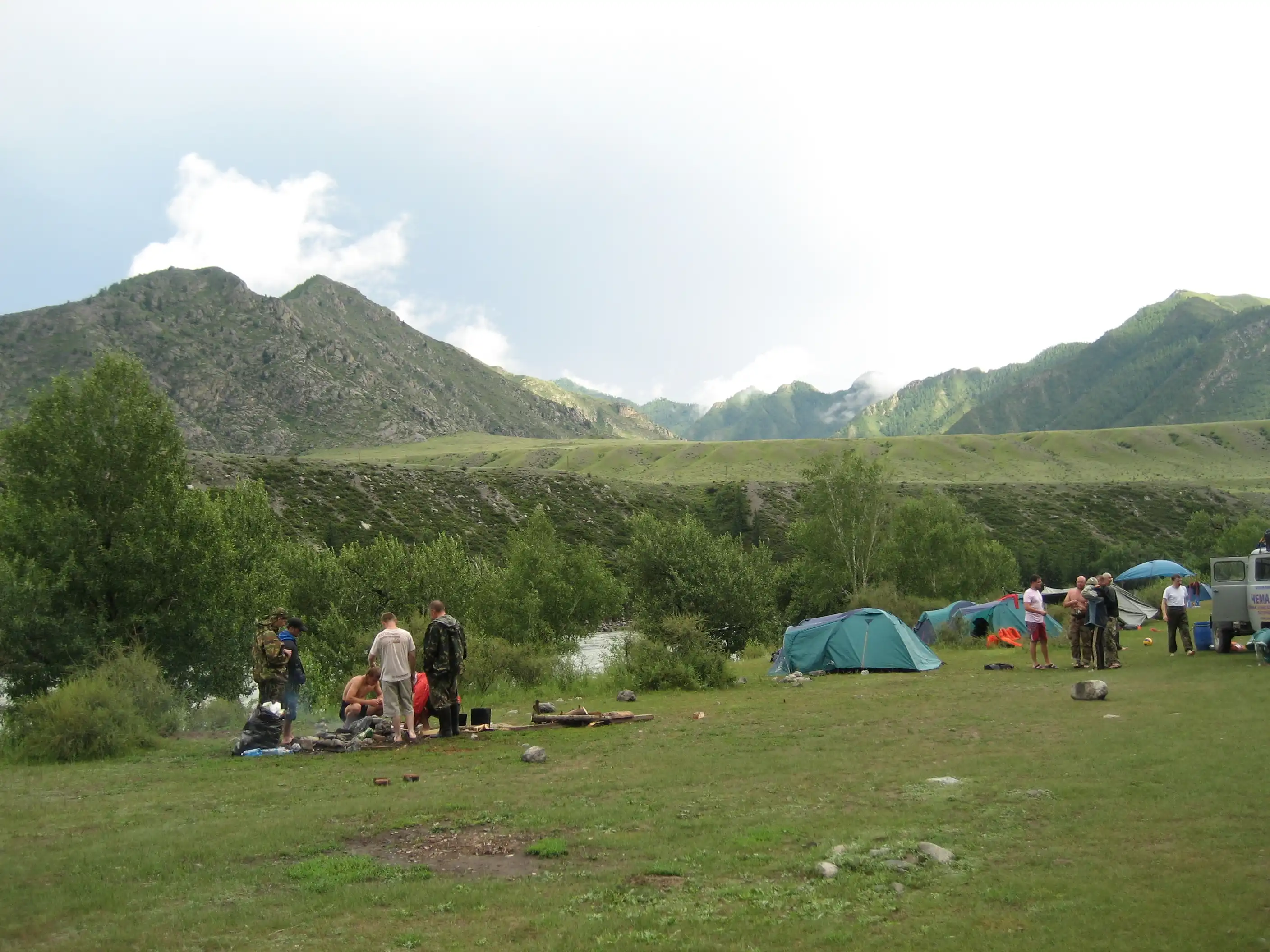 К месту первой стоянки добрались ближе к вечеру. Разгрузили рафты (2 штуки), катамаран (1 штука), прочую снарягу и выгрузились сами (15 туристов + 3 инструктора). Дальше всё было как обычно бывает в походах — палатки, костёр, Кружка Мира (да, у нас с собой было), знакомства с попутчиками, ночёвка.