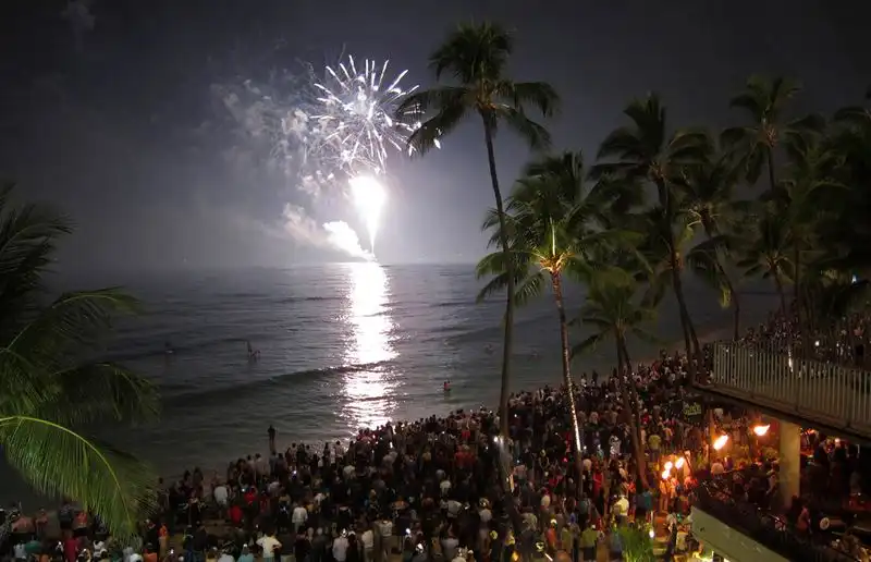 Люди заполонили пляж Вайкики в Гонолулу на Гавайах, чтобы посмотреть на праздничный слют в честь нового 2011 года.