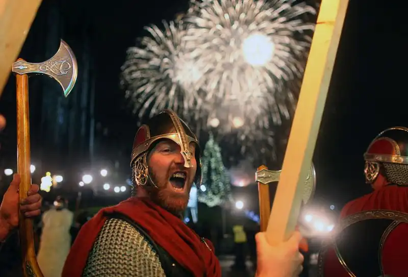 Шотландец, в костюме предводителя викингов, возглавляет факельное шествие на Принцес Стрит в Эдинбурге в начале