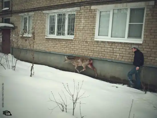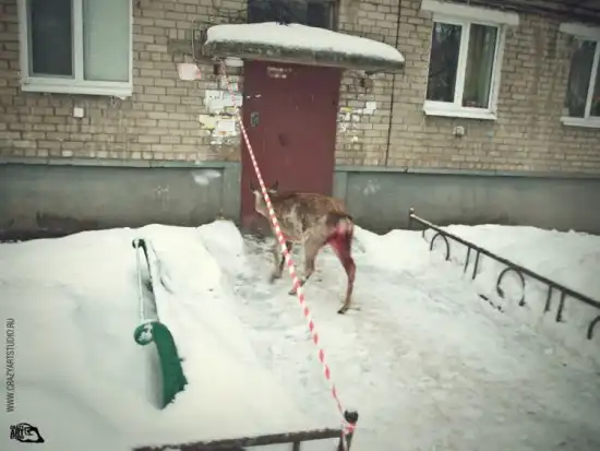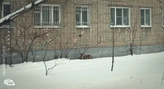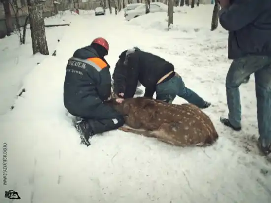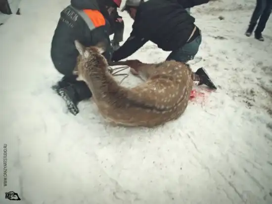 Жители города Ярославла наблюдали необычное явление:маленького оленёнка,которого покусали собаки.